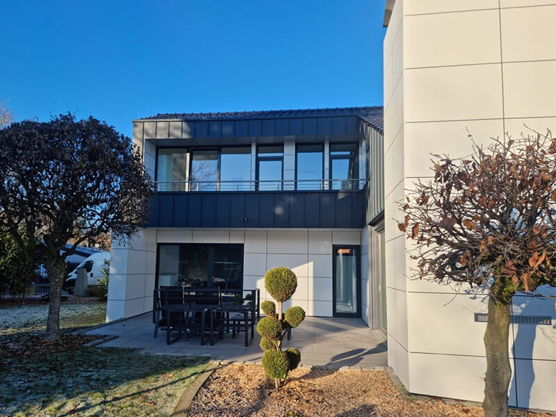 Bij een woonproject vlak over de grens in Duitsland zijn lichtgrijze en witte 8mm HPL platen toegepast als gevelbekleding.